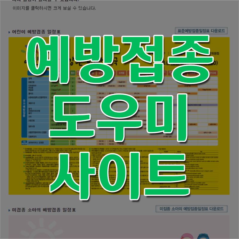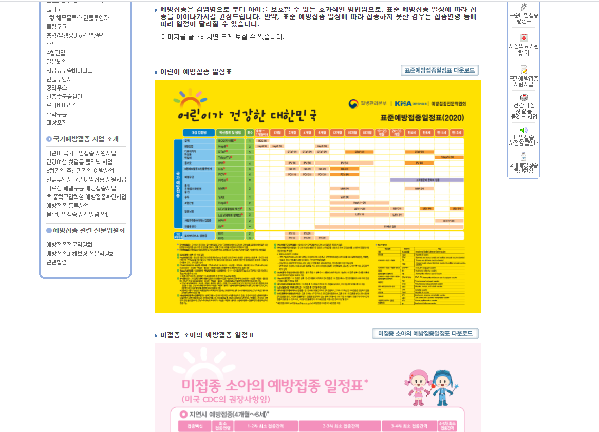 가장 중요한 것이 예방접종 시기인데요. 어린이 예방접종 일정표도 여기서 확인이 가능합니다. 미접종 소아의 일정표도 있어요.