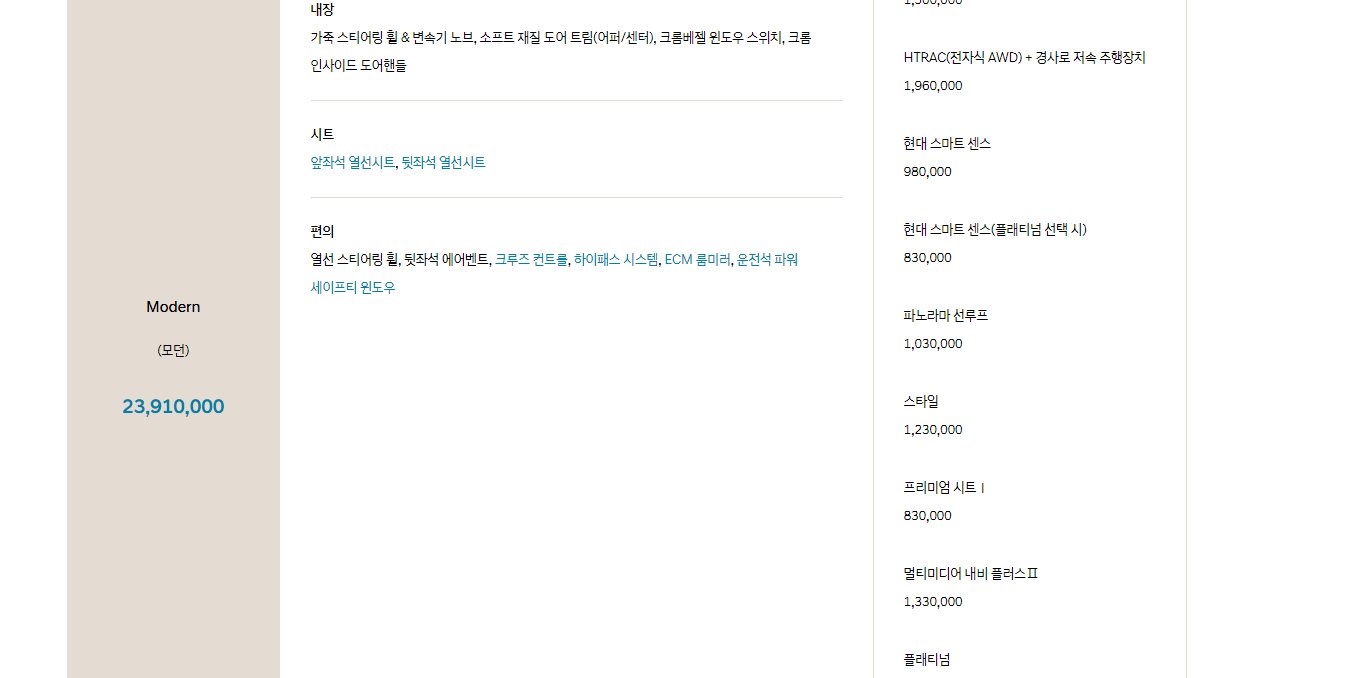 더 올 뉴 투싼은 아니고 현재 판매 중인 현대자동차 투싼 가격표입니다. 스마트, 모던, 모던 초이스 등이 있는데요. 각 트림에 따라서 가격이 상이하니 확인해보시기 바랍니다.