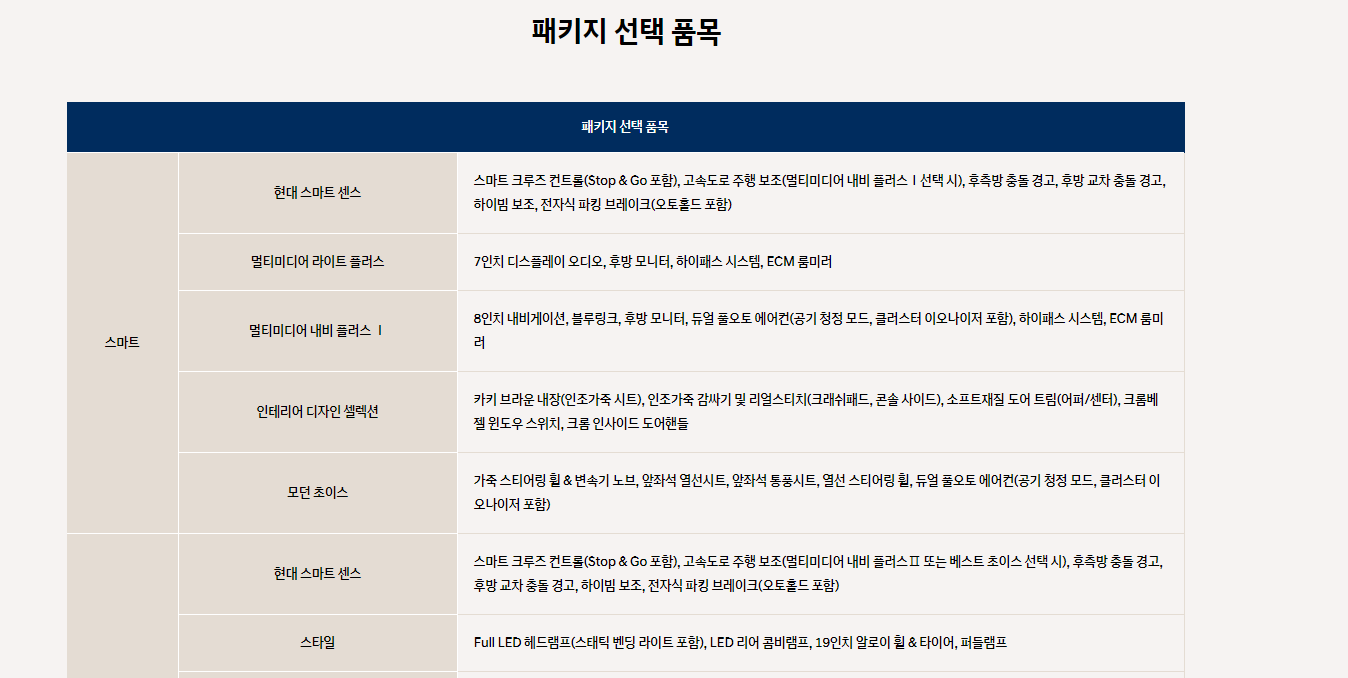패키지 선택 품목인 현대 스마트 센스, 멀티미디어 라이트 플러스, 멀티미디어 내비 플러스, 인테리어 지다인 셀렉션, 모던 초이스, 현대 스마트 센스 등에 대한 설명입니다. 현대자동차 투싼 가격표를 보시려면 아래 링크를 클릭하세요.