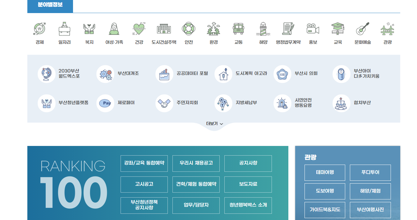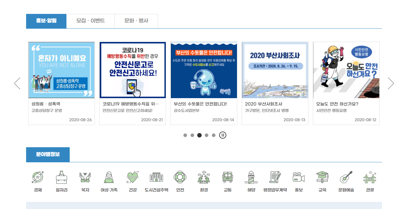 경제, 일자리, 복지, 여성 및 가족, 건강, 도시건설주택, 홍보, 교육, 문화 등 분야별 정보도 검색해보세요!! 그리고 부산시청 홈페이지에서 홍보나 알림, 이벤트, 문화 행사에 대한 정보드 겟뜨!!