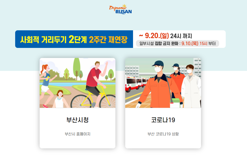 기존의 부산시청 메인 홈페이지로 이동해보겠습니다. 여기서는 지역 소식을 접할 수 있는데요. 2단계 사회적 거리두기가 2주간 재연장 되어서 이와 관련된 내용이 보이네요. 여기서는 조직도, 희망일자리, 동백전, 2차재난지원금, 자원순환과나눔장터, 부산특산품에 대해서 확인해볼 수 있습니다.