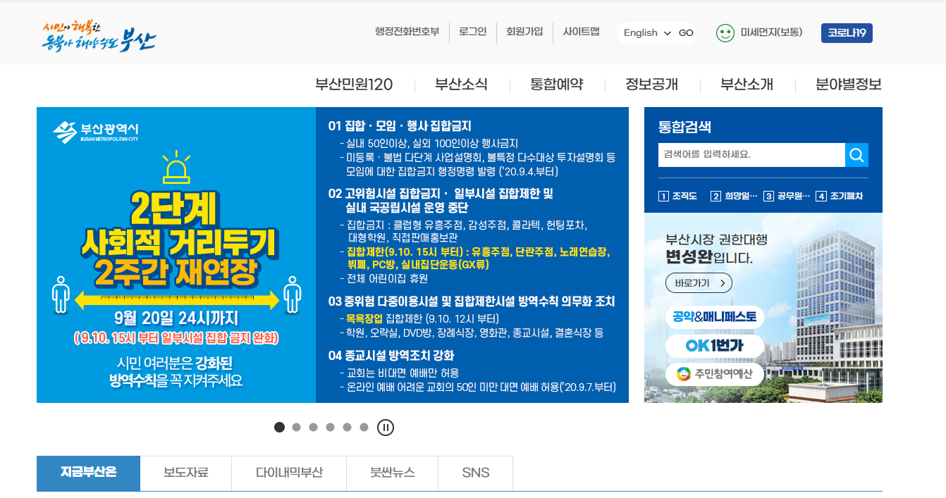 부산시청 홈페이지 소개해드리겠습니다. 현재는 코로나19와 관련하여 부산시청 홈페이지와 부산 코로나19 상황 홈페이지가 별도로 운영중입니다.