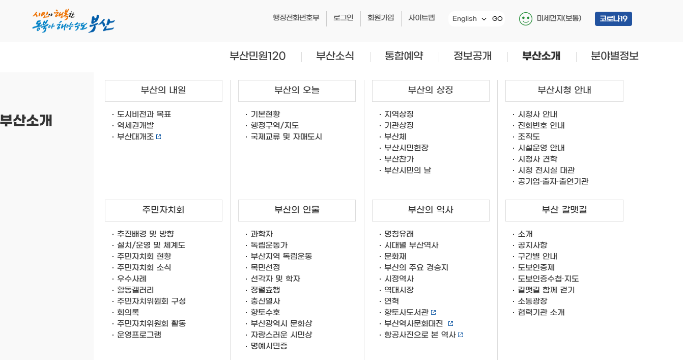 2030부산월드엑스포, 부산대개조, 공공데이터 포털, 도시계획 아고라, 부산시의회, 부산아이 다가치키움, 부산청년플랫폼, 주민자치회, 제로페이, 지방세납부 페이지도 있으니 참고하시고요.