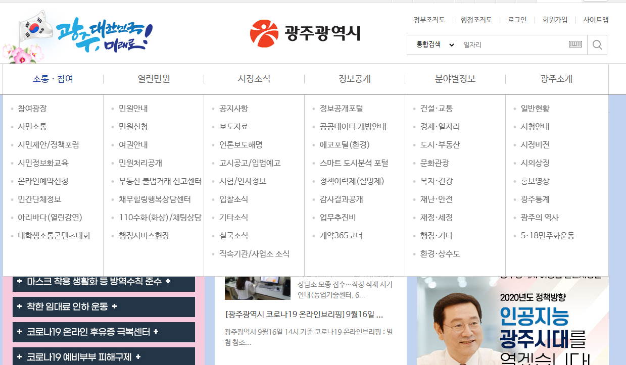 시청 홈페이지 맨 위에 있는 메뉴를 보시면 민원안내, 언론보도해명, 입찰소식, 110수화 채팅 상담, 온라인예약신청, 에코포털, 스마트 도시분석 포털, 계약365코너 등이 있으니 참고 바랍니다.