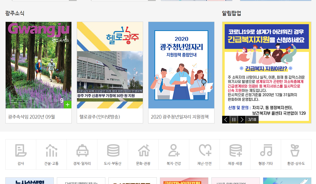 월간 광주속삭임 소식지도 광주광역시청 홈페이지에서 볼 수 있어요. 광주청년일자리 지원정책, 긴급복지지원 등도 확인해보시기 바랍니다. 감사, 건설, 교통, 경제, 일자리, 도시, 부동산, 문화, 관광, 재난, 재정, 세정, 행정, 환경, 상수도에 대한 분야별 정보도 확인 가능합니다.