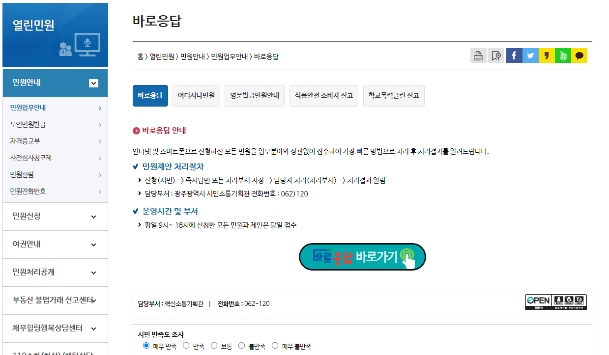 카드뉴스, 광주영상, 바로소통광주, 바로응답을 통한 서비스도 이용할 수 있고요. 부서 전화번호 및 직원 전화번호도 확인하실 수 있습니다. 광주전남공동혁신도시 빛가람, 아리바다, 시민참여에산제, 정비사업관리시트템도 여기서 볼 수 있습니다.