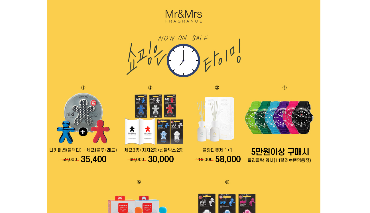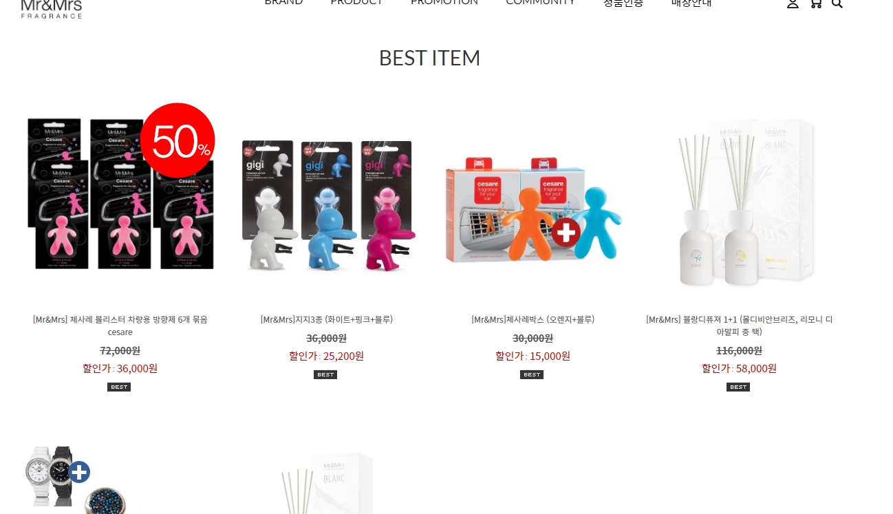 현재 미스터앤미세스 제사레 블리스터 차량용 방향제 6개 묶음이 50% 세일 중이네요!! 그 외에 베스트 아이템으로 지지3종(화이트, 블루, 핑크), 제사레박스, 블랑디퓨저 등이 있습니다.