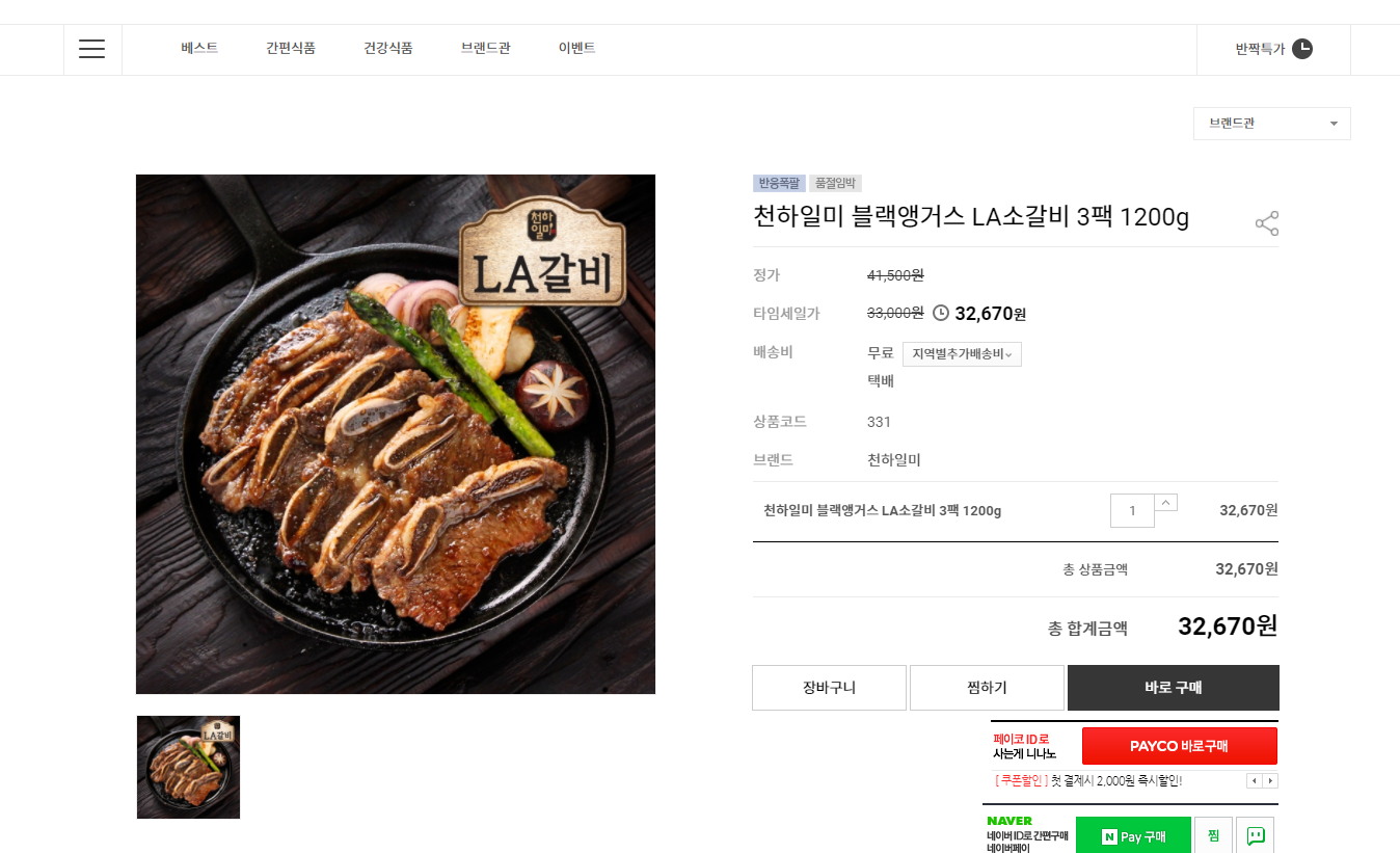 천하일미 LA갈비 제대로 구경해볼게요. 현재 할인 행사 중인데요. 41,500원짜리를 32,670원에 구매할 수 있습니다. 배송료는 없어요. 무료 배송입니다.