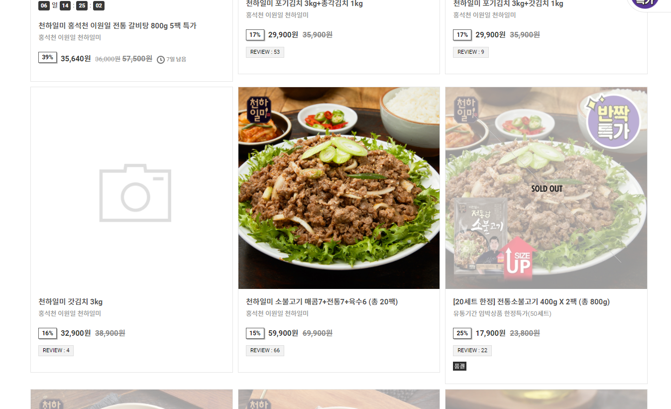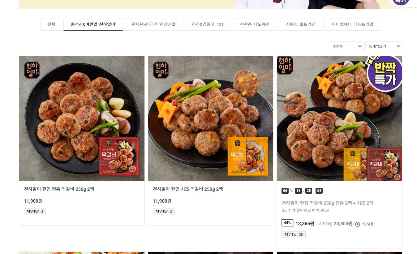그 중에서 우리가 살펴볼 것은 홍석천&이원일의 천하일미입니다. 우선 보이는 게 떡갈비인데요. 아이들 반찬으로도 딱 좋은 요리죠. 전통 떡갈비와 치즈 떡갈비가 있네요. 가격은 2팩에 11,900원입니다.