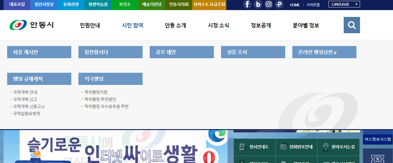 안동시 홈페이지 시민 참여 메뉴에서는 자유게시판, 칭찬합시다, 공모 제안, 설문 조사, 온랑니 행정심판, 행정 규제개혁 등이 있어요.