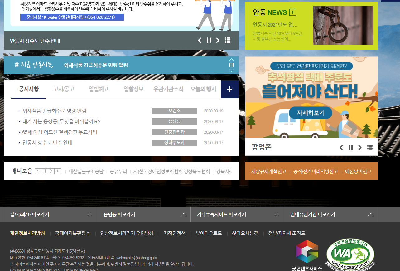 안동시청 홈페이지 바로가기 소개해드립니다. 각 지방자치단체에서는 홈페이지를 운영하고 있는데요.