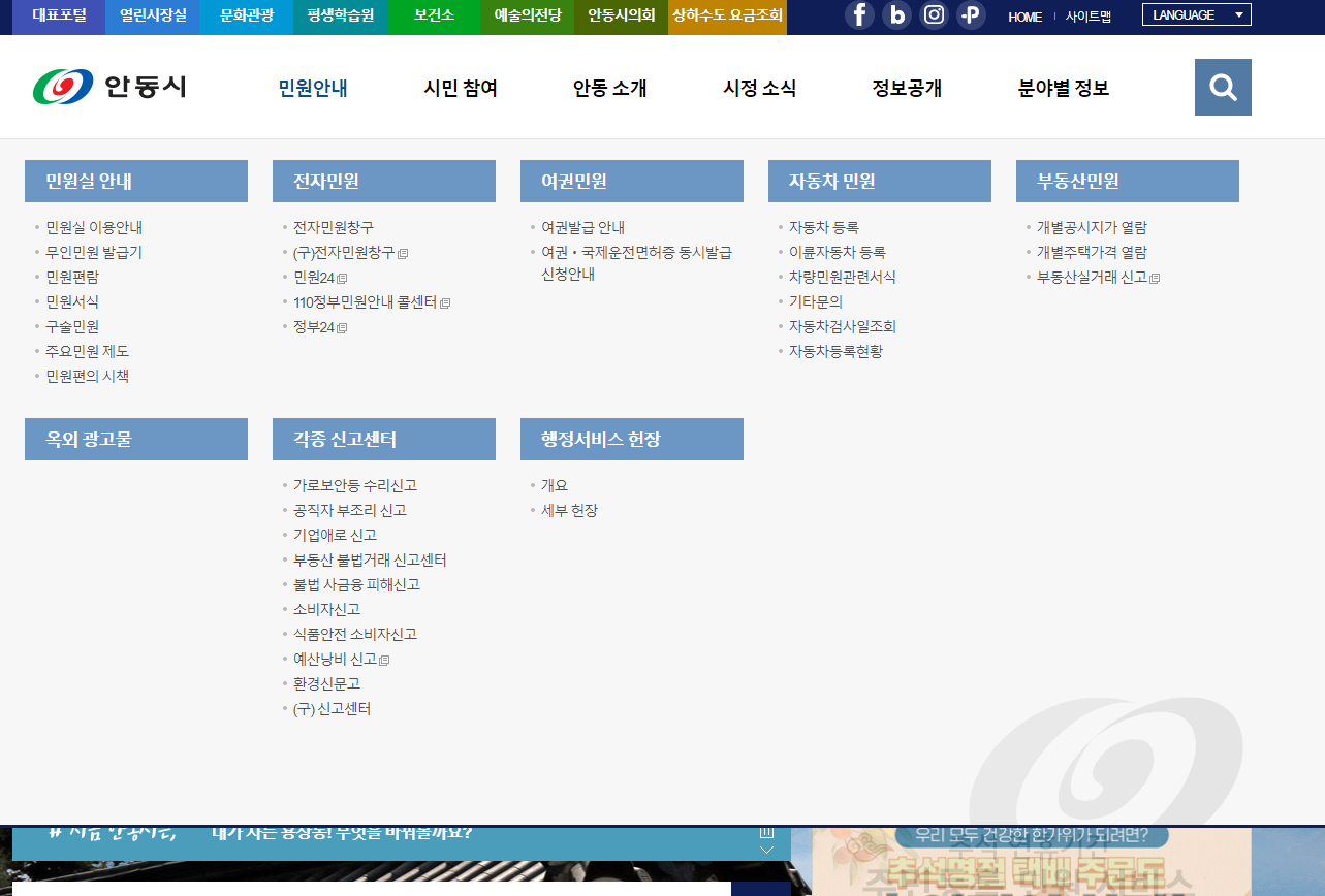 안동시청 홈페이지에는 민원실 안내도 있는데요. 무인민원 발급기, 민원서식, 민원편람도 있고요. 전자민원창구에서 해결할 수도있습니다. 여권, 자동차 관련 민원에 대한 내용도 살펴보세요. 그리고 가로보안등 수리신고, 공직자 부조리 신고, 기업애로 신고 등도 할 수 있습니다.