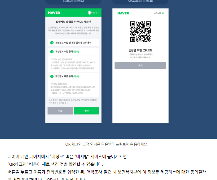 저도 실제로 네이버 전자출입명부 QR코드 체크인을 사용을 해보았습니다.