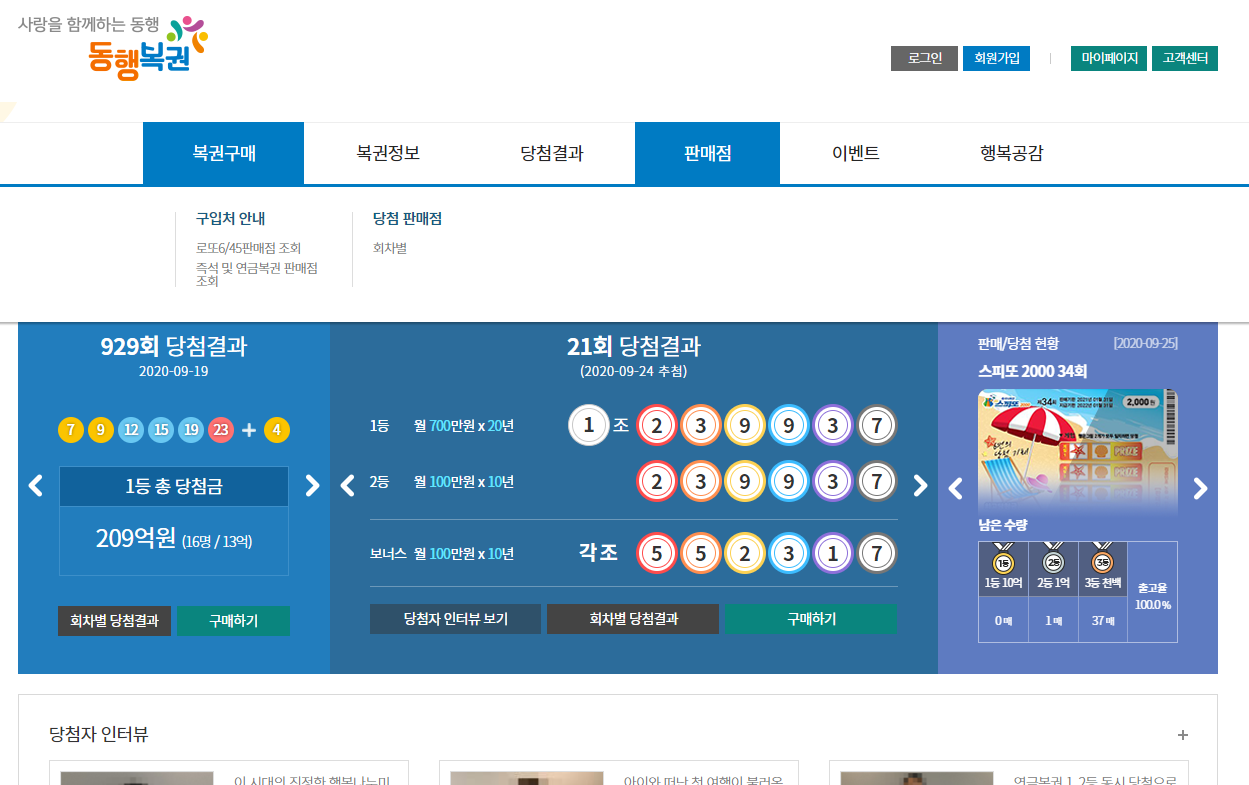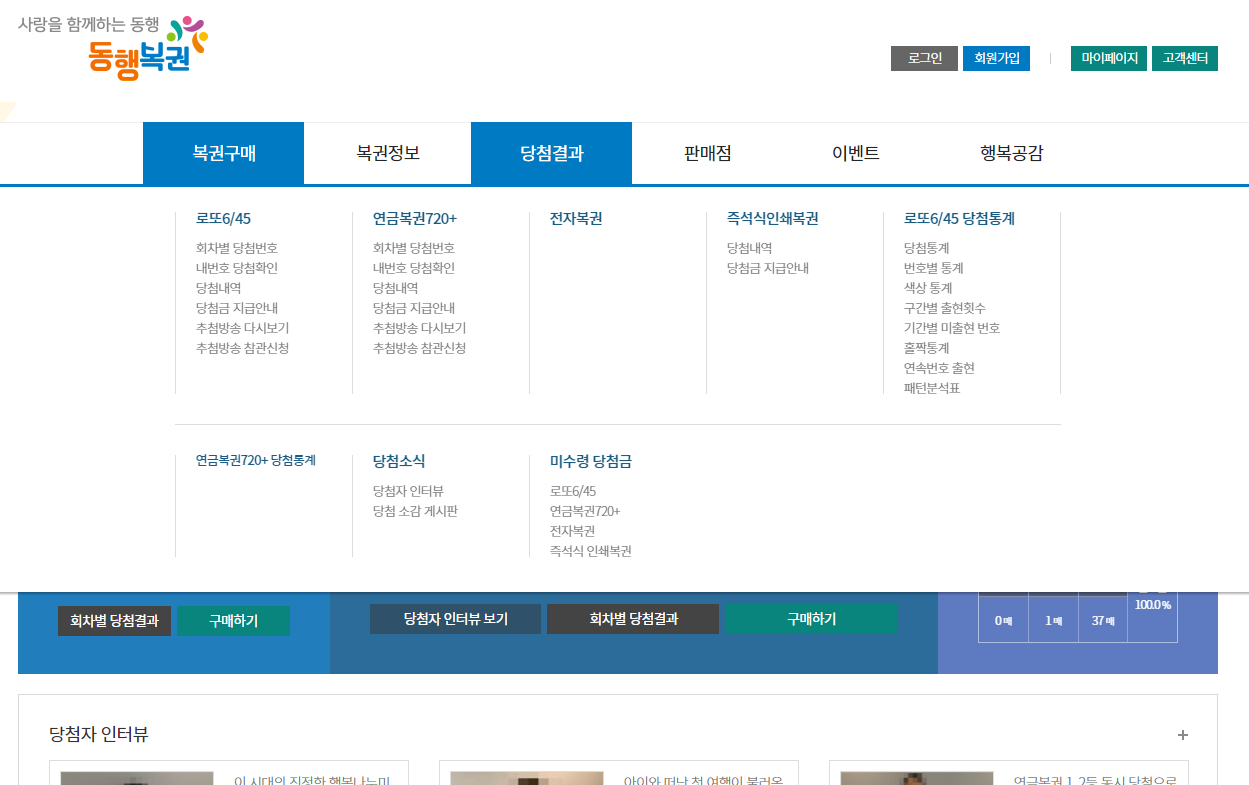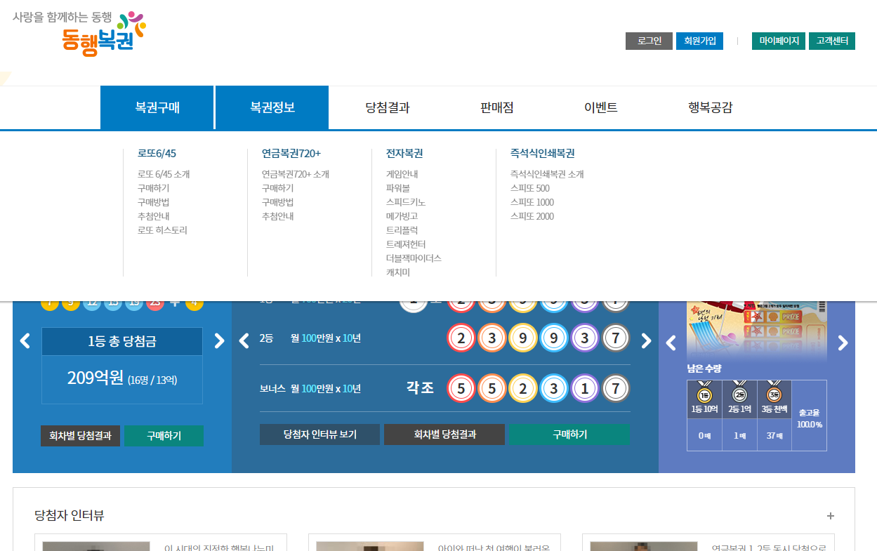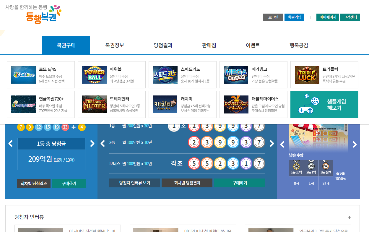동행복권 홈페이지에서는 당첨자 인터뷰도 볼 수 있는데요. 진짜 부럽습니다. ㅠㅠ 그리고 전자복권이라고 해서 인터넷으로 구매가 가능해요. 연금복권, 파워볼, 스피드 키노, 메가빙고, 트리플럭, 트레져헌터, 캐치미, 더블잭마이더스가 있네요.