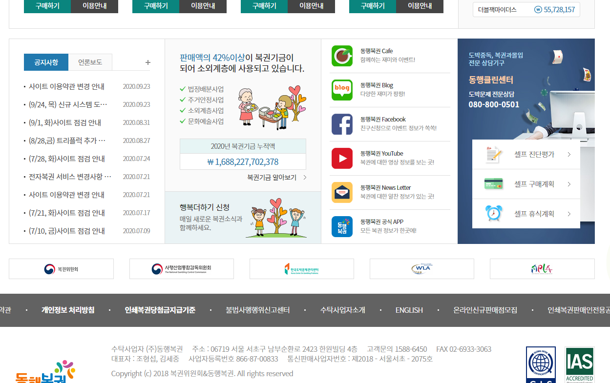 동행복권 홈페이지에서는 판매액의 42%이상이 복권기금이 되어 소외계층에 사용되고 있다고 해요. 그 외에 동행복권 네이버카페, 네이버 블로그, 페이스북, 유튜브, 뉴스레터, 어플로 갈 수 있는 링크가 있으니 참고하시고요. 도박중독, 복권과몰입 전문 상담기구인 동행클린센터도 운영중입니다.