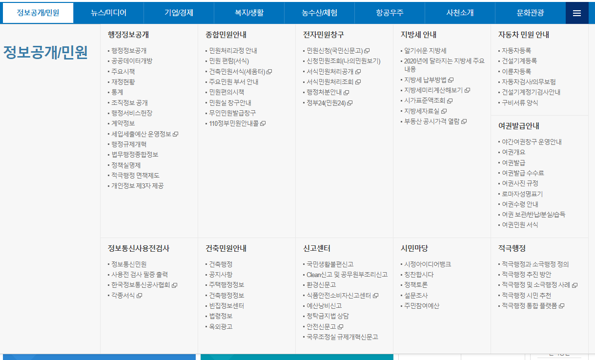 정보공개 민원 메뉴에서는 민원편람, 정보통신민원, 주요시책, 통계, 조직정보 공개, 정책실명제, 알기쉬운 지방세, 시가표준액조회, 지방세자료실, 부동산 공시가격 열람, 민원신청, 국민생활불편신고, 환경신문고, 예산낭비신문고, 자동차등록, 건설기계 등록, 이륜차 등록, 자동차 검사, 여권발급, 여권발급 수수료 등에 대해서 확인할 수 있었습니다.