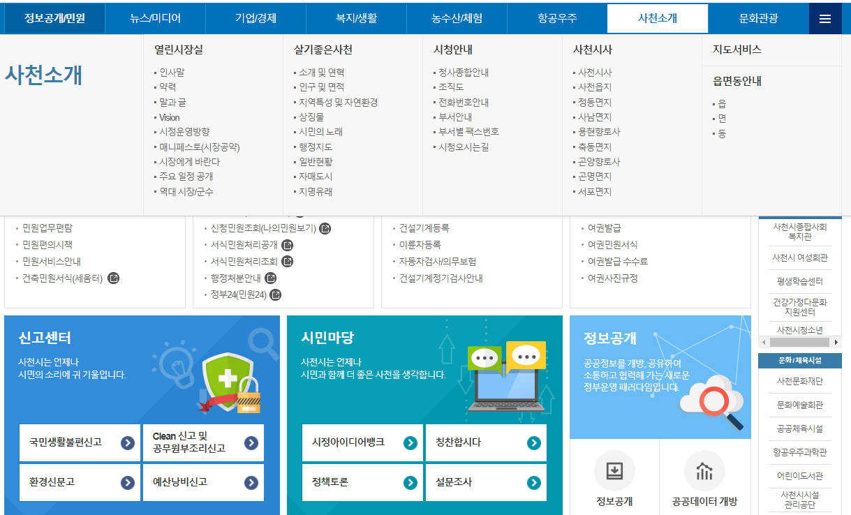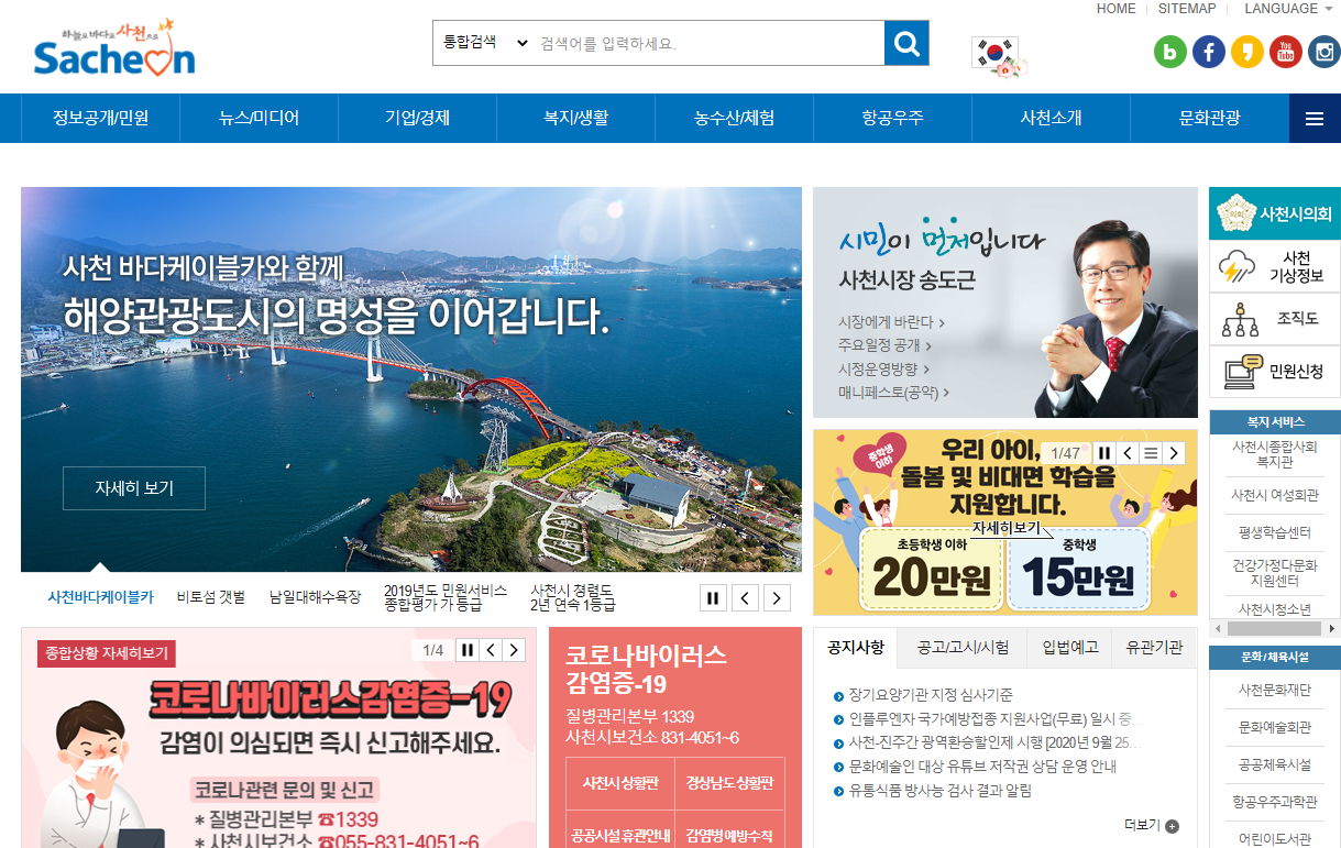 오늘은 사천시청 홈페이지를 방문해보았습니다. 지역 소식과 지역 정보를 한눈에 볼 수 있는 곳이지요.