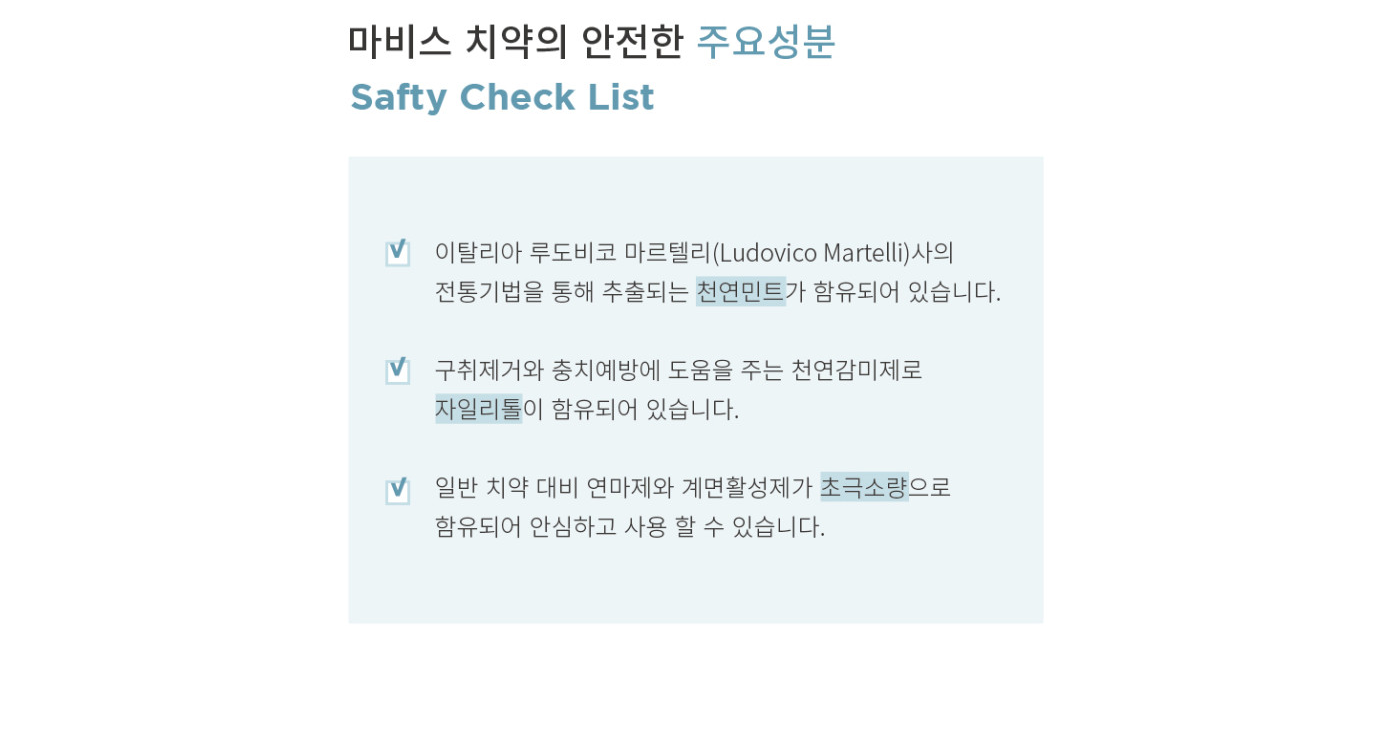 마비스 치약에는 이탈리아 루도비코 마르텔리 사의 전통 기법으로 추출한 천연민트가 함유되어 있다고 합니다!! 천연감미제로 자일리톨도 함유되어 있고요. ㅎㅎ
