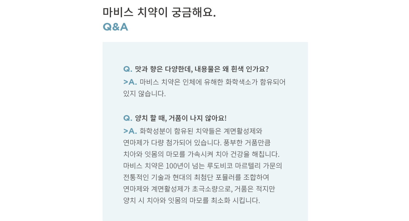 마비스치약에는 유해한 화학색소가 함유되어 있지 않아서 흰색이고요. 연마제와 게면활성제가 초극소량 들어 있기 때문에 거품도 많이 나지 않아요. 소중한 우리 가족을 위해서도 너무나 좋은 마비스 치약!!