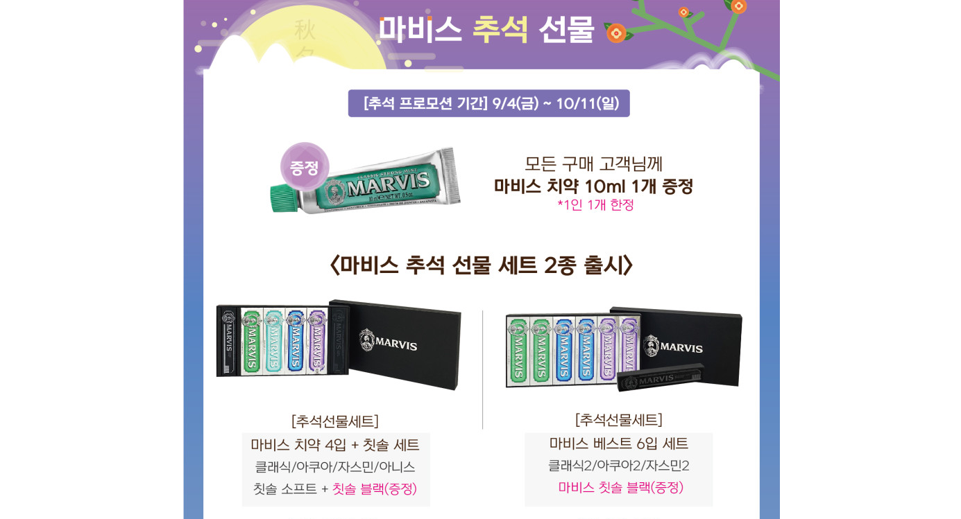 마비스 추석 선물 세트입니다. 마비스 치약 4입 + 칫솔 세트가 있네요. 소중한 사람들에게 명절 때 선물로 딱이네요.