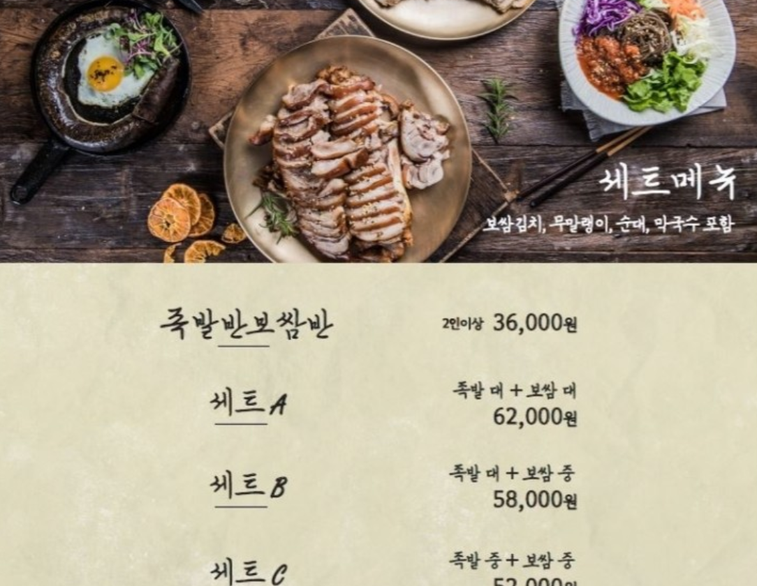 세트 메뉴 가격 참고 바라요. 세트에는 보쌈김치, 무말랭이, 순대, 막국수가 포함되어 있습니다.