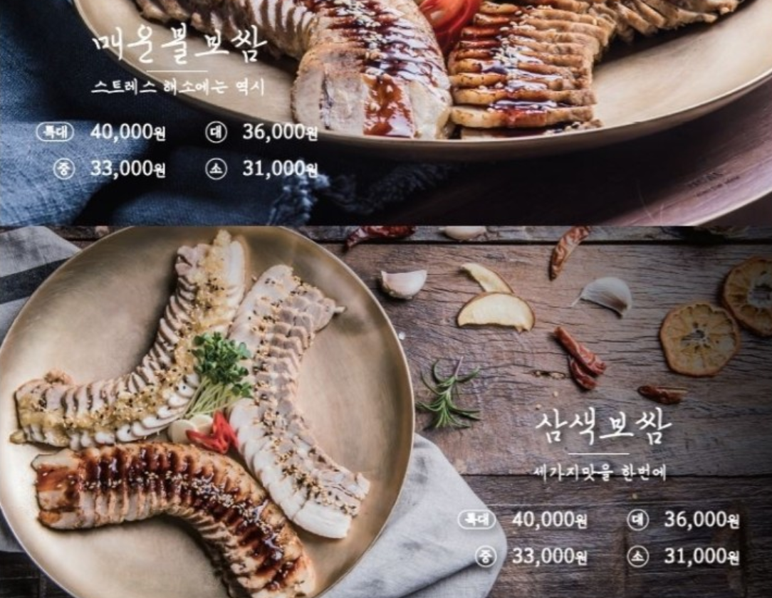 매운불보쌈과 삼색보쌈도 있는데요. 삼색보쌈은 세가지 맛을 한번에 즐길수 있어서 좋아요.