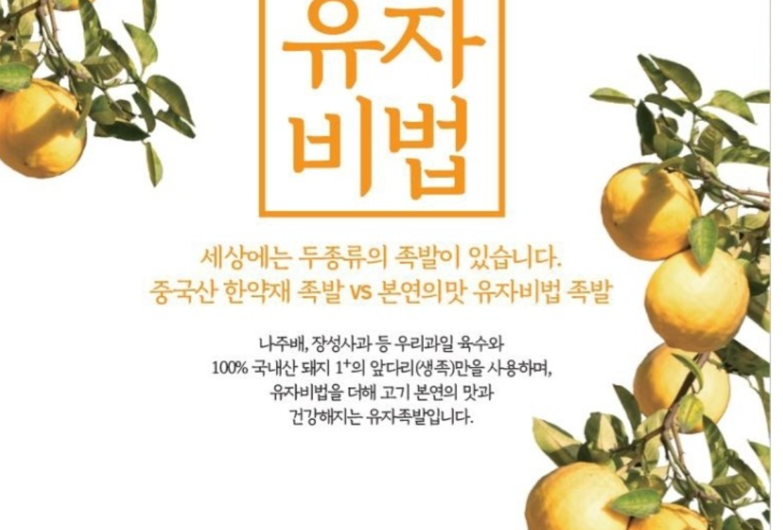 유자비법으로 만든 족발!! 나주배, 장성사과 등 우리나라 과일을 사용해서 육수를 내고 국내산 1+ 돼지 앞다리를 사용한다고 해요.