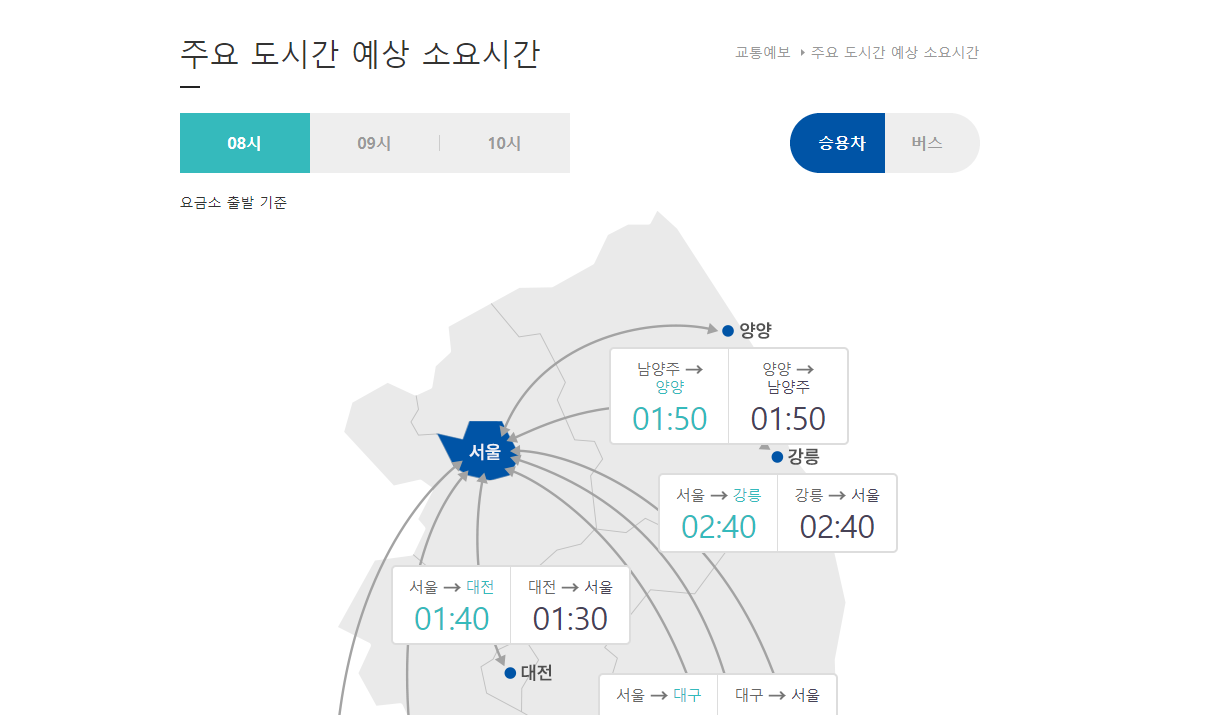 주요 도시간 예상 소요시간도 로드플러스에서 확인할 수 있어요. 서울에서 대전, 대전에서 서울, 남양주에서 양양, 서울에서 강릉, 서울에서 대구, 서울에서 부산 등으로 이동할 때 걸리는 시간이 나와있네요. 승용차 기준 혹은 버스 기준으로 볼 수 있어요.