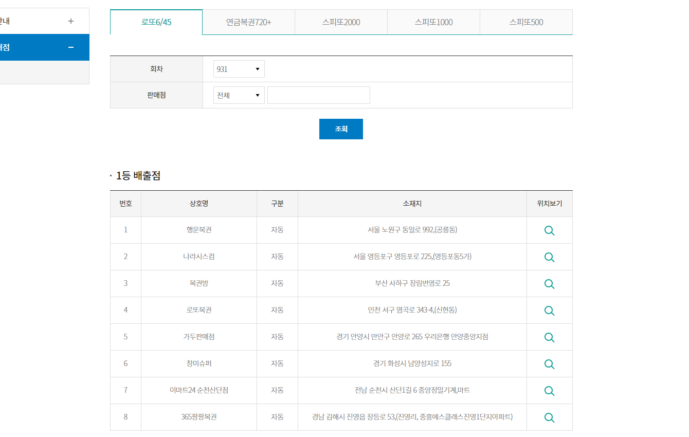 이렇게 로또 회차별로 1등 및 2등이 나온 복권집의 상호명, 자동인지 수동인지 여부, 소재지 주소, 위치 지도 보기가 가능해요.