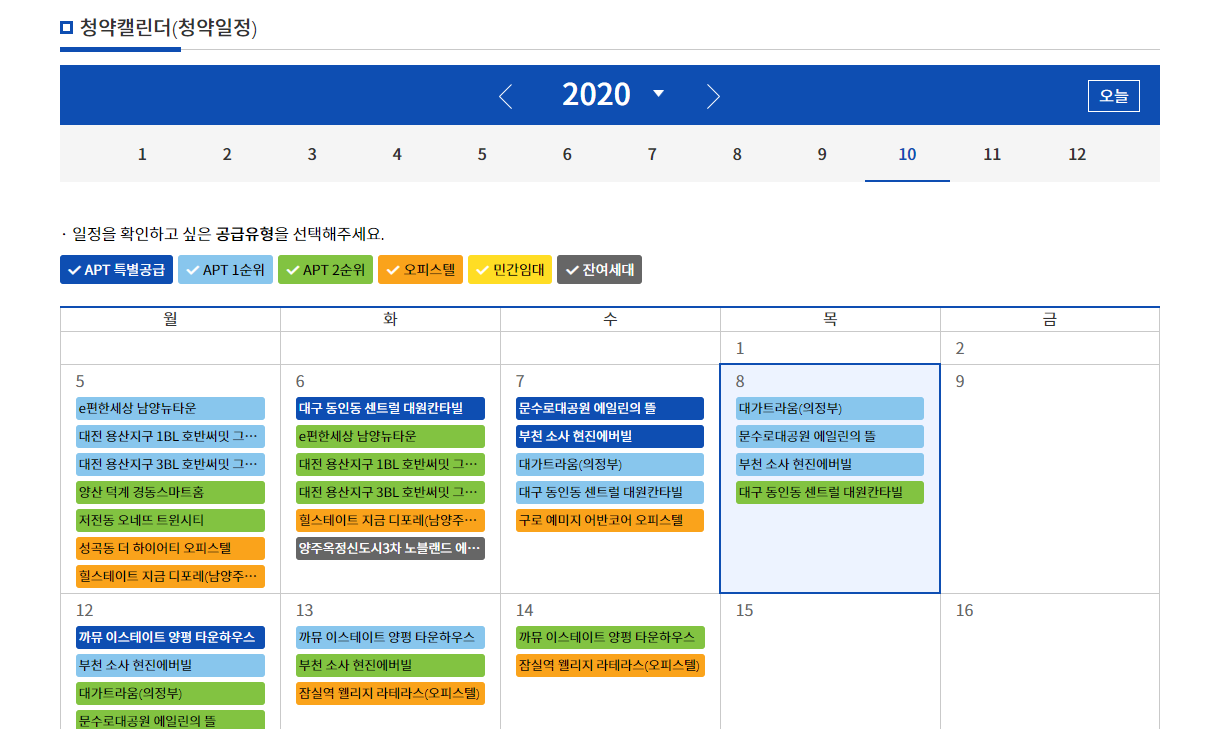 저는 일정을 살펴보았는데요. 아파트(APT) 특별공급, 1순위, 2순위 등의 공급 일정을 볼 수 있어요. e편한세상 남양뉴타운, 양산 덕계 경동스마트홈, 부천 소사 현진에버빌, 문수로대공원 에일린의뜰, 대가트라움(의정부), 대전 용산지구, 양주옥정신도시3차, 잠실역 웰리지 라테라스, 까유 이스테이트 양평 타운하우스 등이 일정이 나와있습니다.