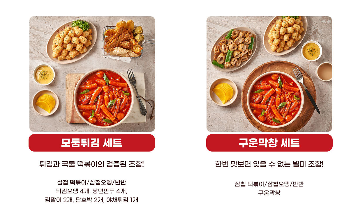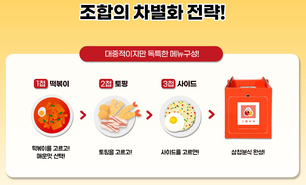 삼첩분식에서는 세트 메뉴를 고르는 방식이 신기해요. 떡볶이를 고르고 토핑을 고르고 그리고 사이드를 고르면 삼첩분식 완성!!