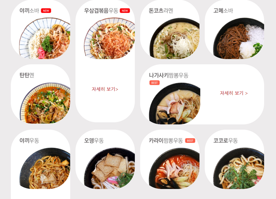 그리고 코코로카레 누들 메뉴입니다. 야끼소바, 우삼겹볶음우동, 돈코츠라멘, 고메소바, 탄탄멘, 나가사키짬뽕우동, 야끼우동, 오뎅우동, 카라이짬뽕우동, 코코루우동이 있습니다.