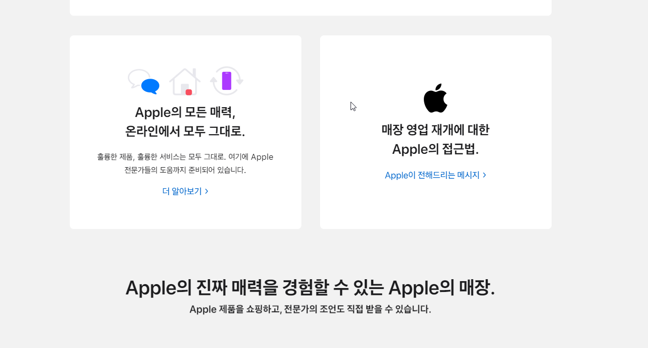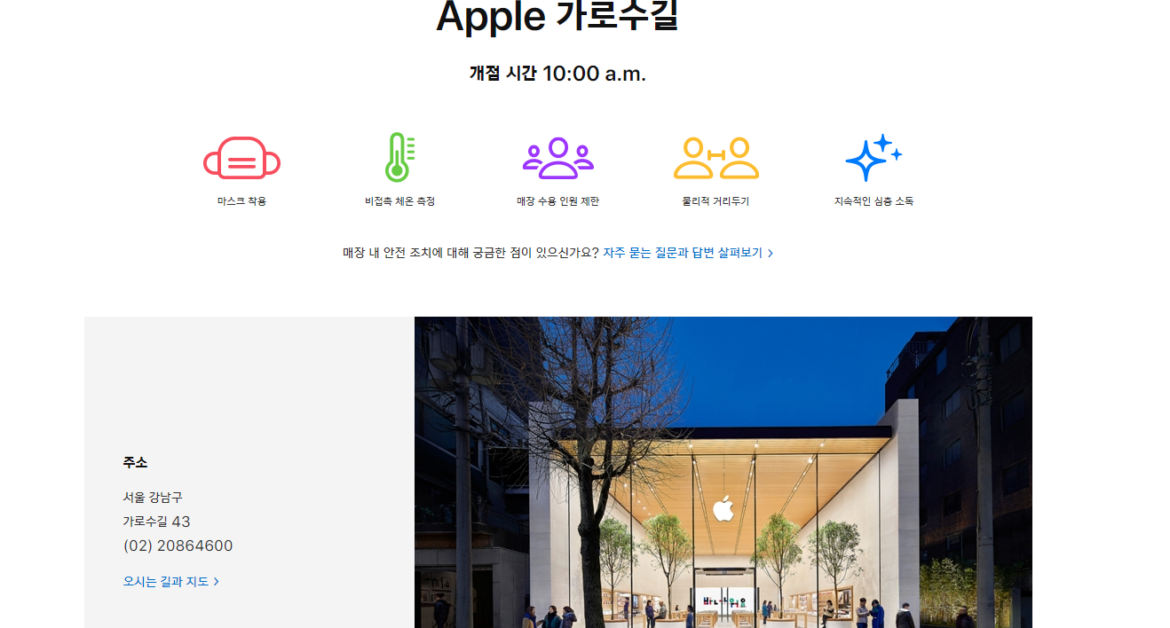 애플스토어 가로수길이 매장 재개장을 했다고 하는데요. 코로나 관련해서 마스크 착용, 비접촉 체온 측정, 매장 수용인원 제한, 물리적 거리두기, 지속적인 심층 소독을 진행하고 있다고 합니다.