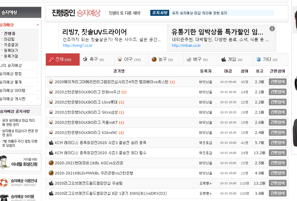 승자예상에서는 미네랄로 축구, 야구, 농구, 배구 등의 경기에 배팅하는 게 있네용.