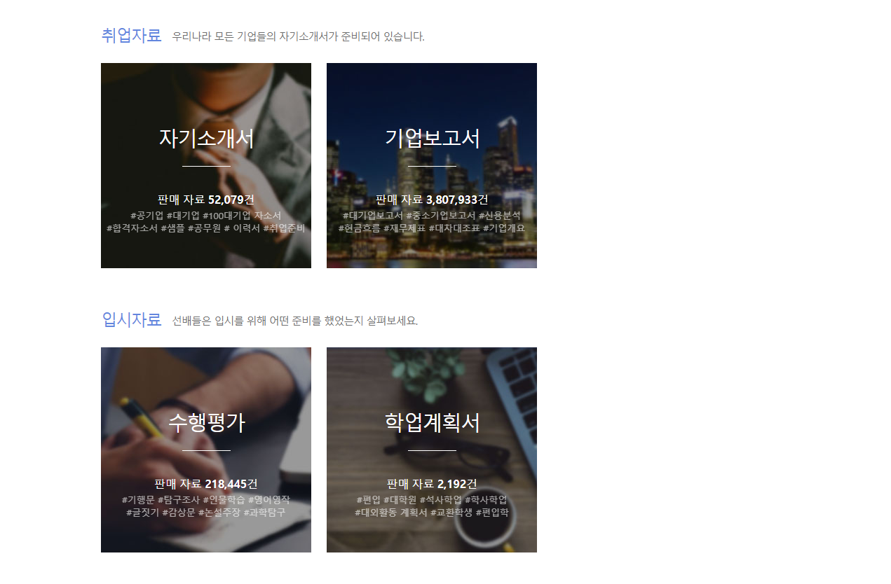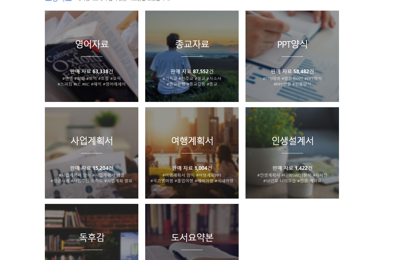 영어자료(번역, 토익, 토플, 회화, 스피킹, 영어에세이), 종교자료(기독교, 천쥬교, 불교 자소서, 종규분쟁, 종교갈등, 종교), PPT양식(프레젠테이션 테마, 발표용 PPT 양식, 샘플), 사업계획서(양식, 샘플, 성공사례, 조직도, 발표자료), 여행계획서(국가별여행, 졸업여행, 해외여행, 국내여행), 인생설계서(SWOT분석, 자서전), 독후감, 도서요약본 등이 있습니다.