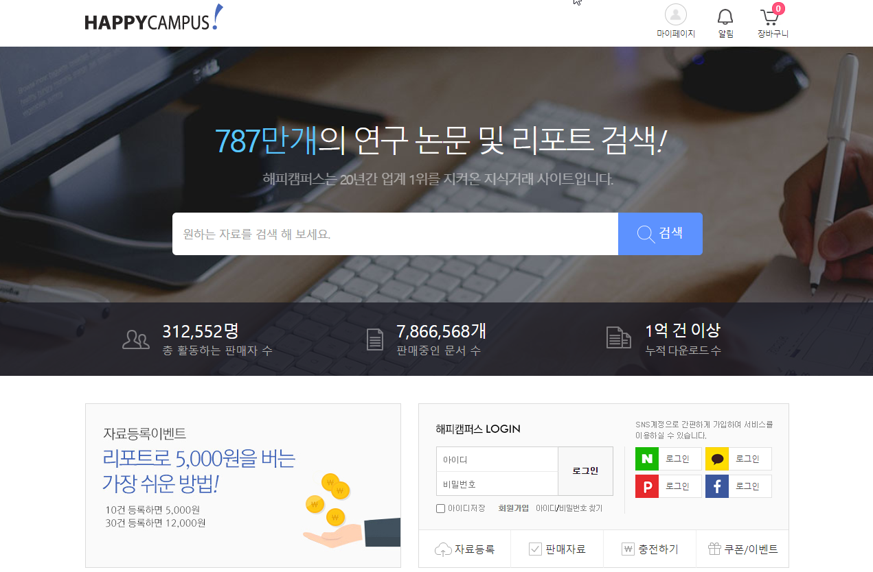 연구 논문 및 리포트를 검색할 수 있는 해피캠퍼스는 지식거래 사이트라고 보시면 되는데요. 다양한 자료들이 있습니다.