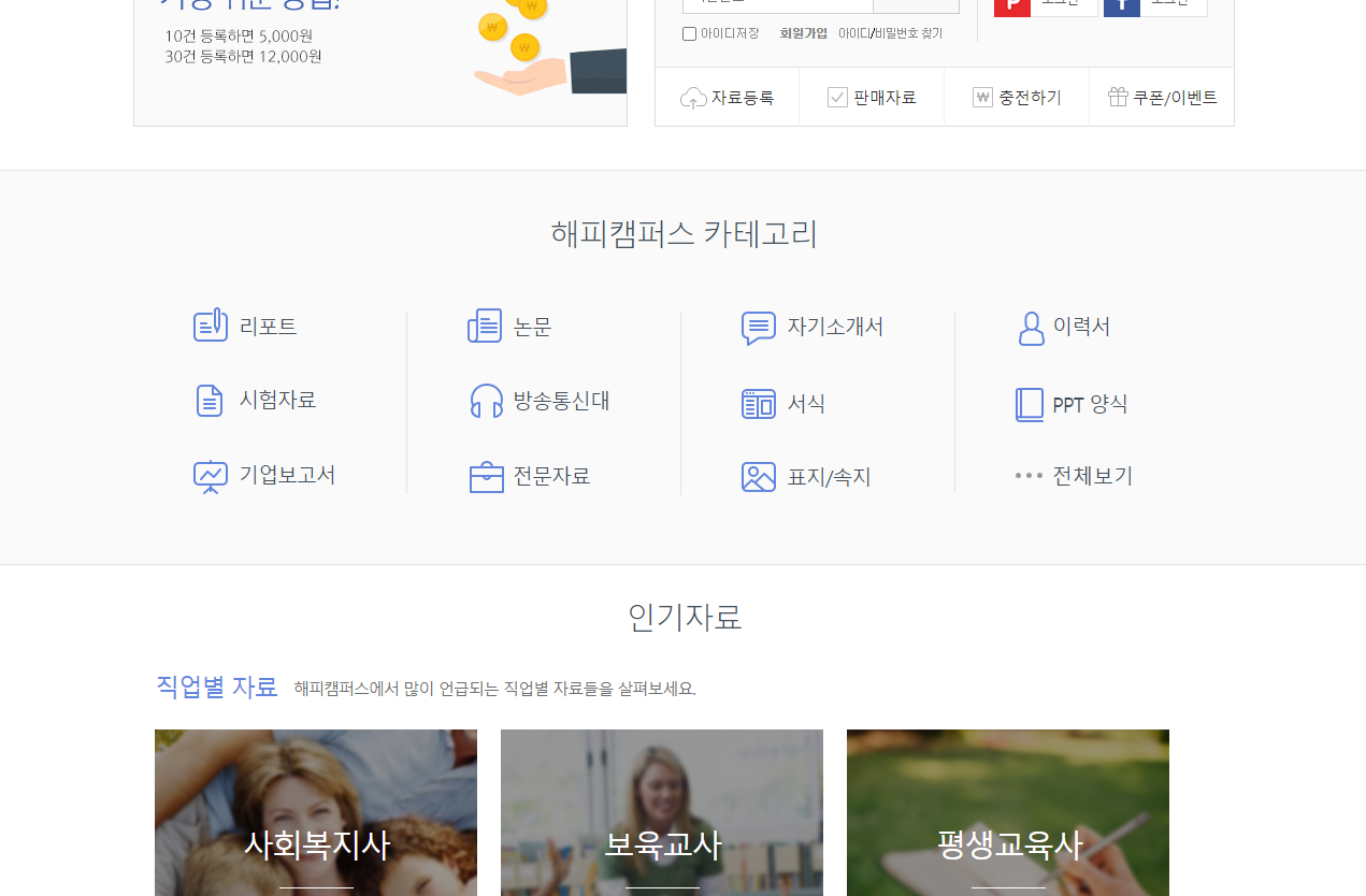 리포트, 논문, 자기소개서, 이력서, 시험자료, 방송통신대 자료, 각종 서식, PPT 양식, 기업보고서, 전문자료, 표지 및 속지 등을 구할 수 있는 해피캠퍼스!! 유용한 곳이지요.