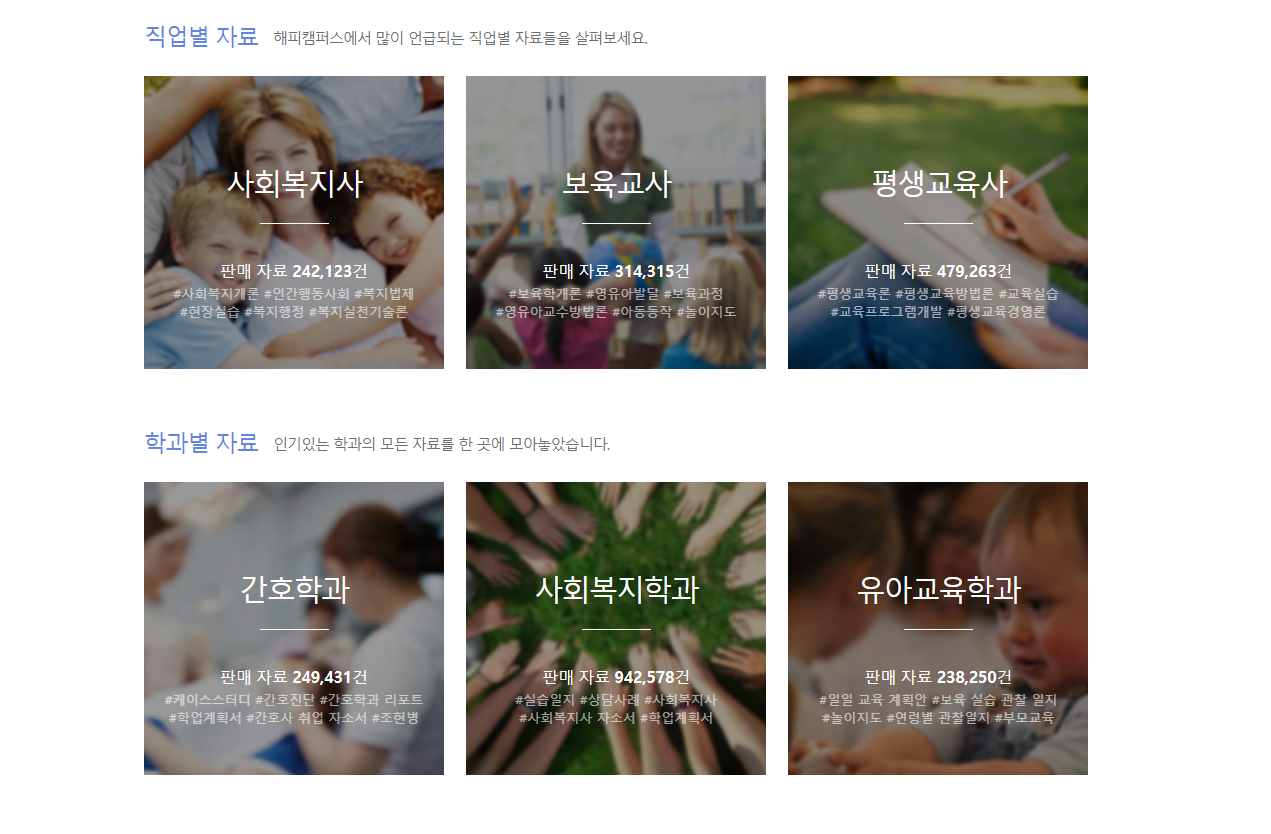 대기업이나 중소기업 기업보고서나 대학생과외 시험자료, 자격시험 시험자료 등이 있습니다. 이력서나 외국어이력서 구할 수 있고요. PPT 양식도 있습니다. 사회복지사, 보육교사, 평생교육사 등 직업별 자료도 찾아볼 수 있습니다. 해피캠퍼스에서는 간호학과, 사회복지학과, 유아교육학과와 관련된 자료도 있어요.