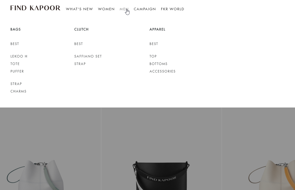 파인드카푸어 FIND KAPOOR 남자 제품으로는 레쿠H백, 토트백, PUFFER, 스트랩, 참 등이 있어요. 클러치백도 있고요. 스웻셔츠, 하프팬츠 등의 의류도 있습니다.