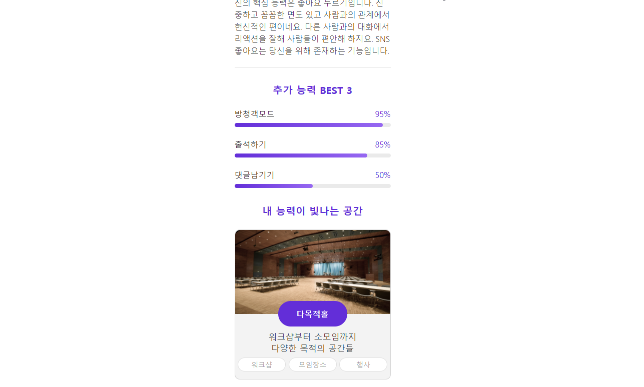 추가 능력 BEST3도 있는데요. 방청객모드, 출석하기, 댓글남기기라고 합니다. 방청객모드도 리액션인 것 같고... 출석하기는 성실성?? 그런 성격을 의미하는 것 같아요. 내 능력이 빛나는 공간은 다목적홀이라고 하네요. 워크샵부터 소모임까지 다양한 목적의 공간들!!