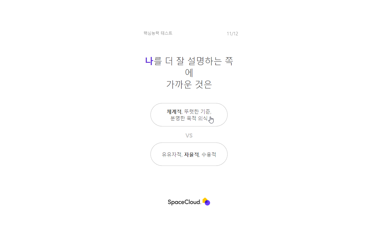 스낵 성격테스트에 이어서 오늘은 핵심능력 테스트를 가져왔습니다. 스페이스클라우드에서 제공하는 성격 테스트인데요. 문제가 12개밖에 되지 않아서 가볍게 해볼만 합니다.