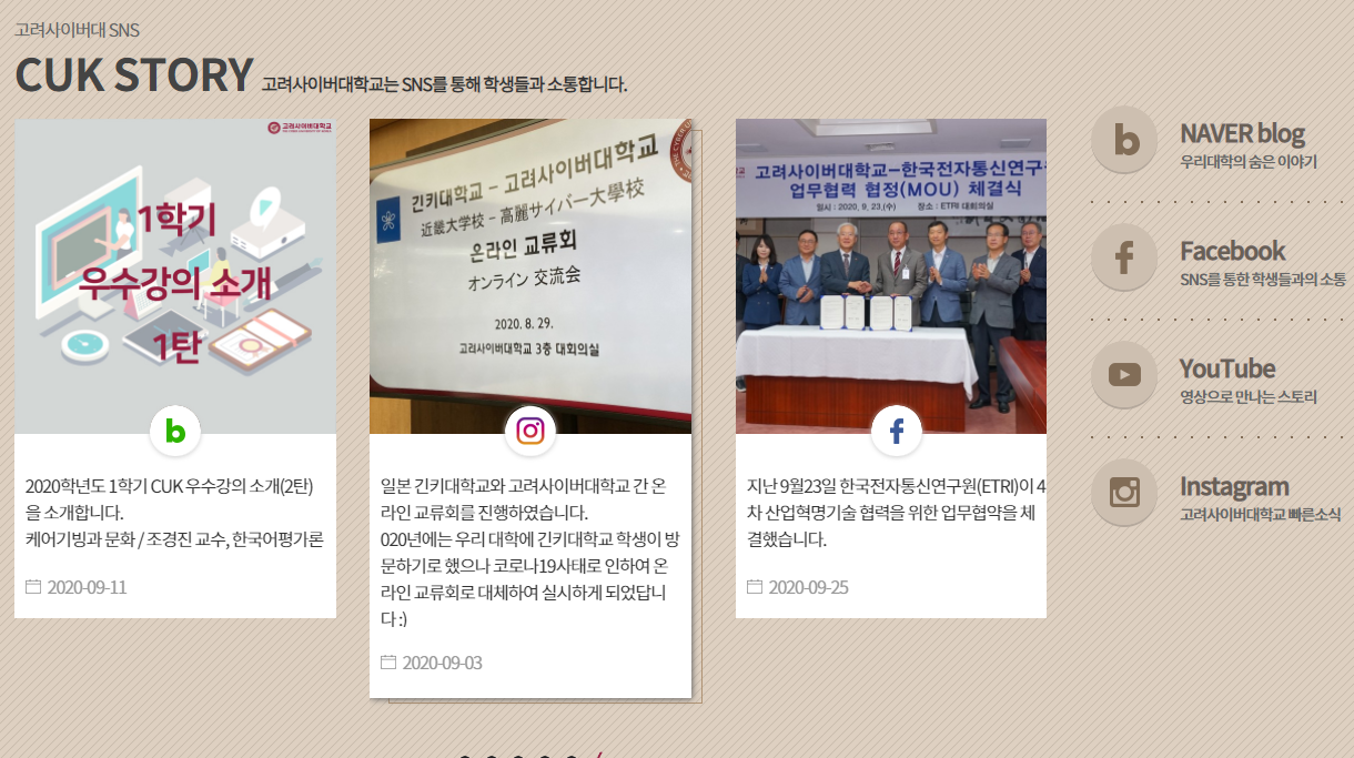 2020학년도 1학기 CUK 우수강의 소개, 온라인 교류회 등의 소식도 확인할 수 있고요. 네이버 블로그, 페이스북, 유튜브, 인스타그램 바로가기가 있어요.