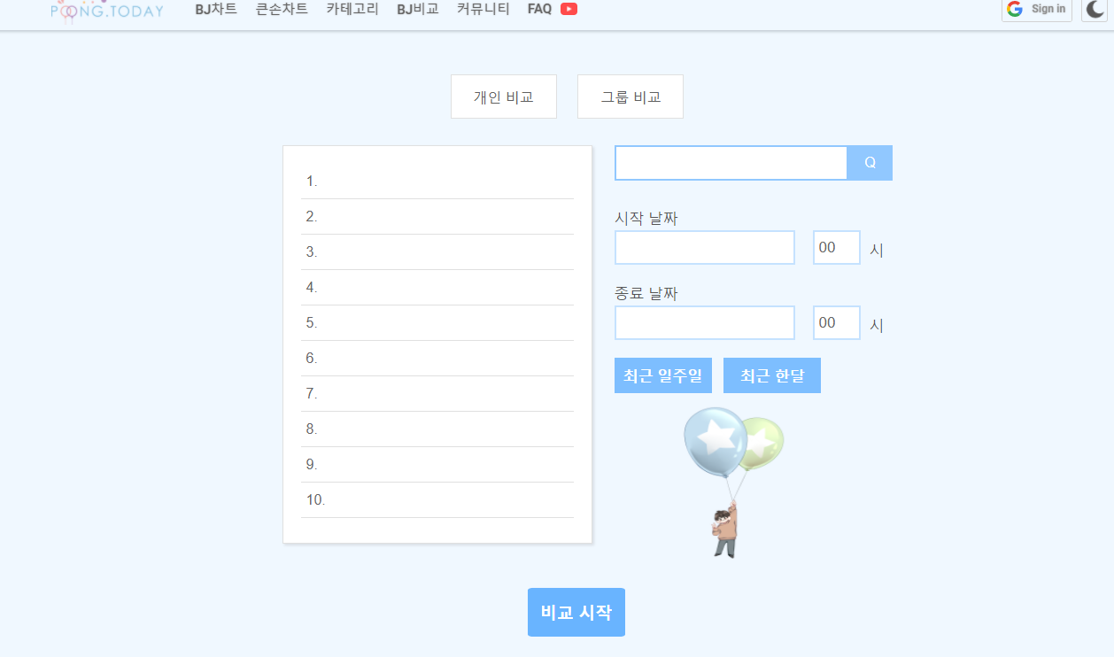 풍투데이 바로가기입니다. 인기 BJ 차트를 볼 수 있는 사이트이지요.