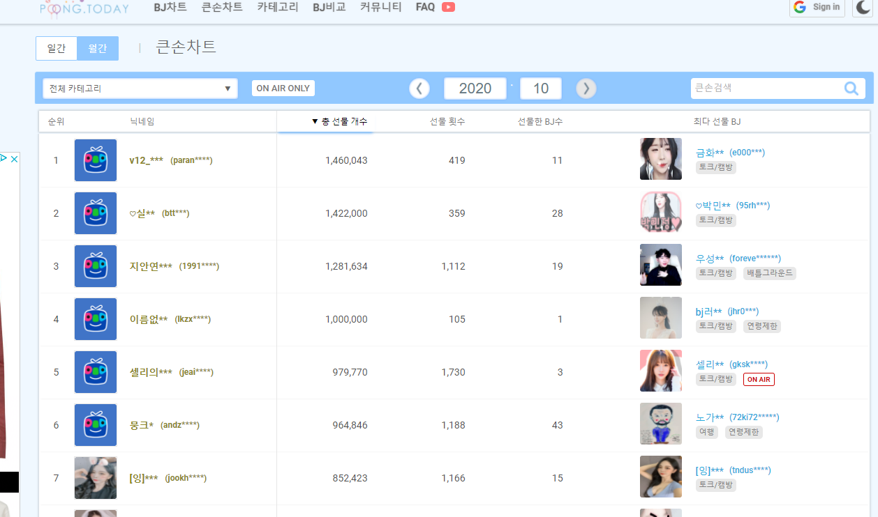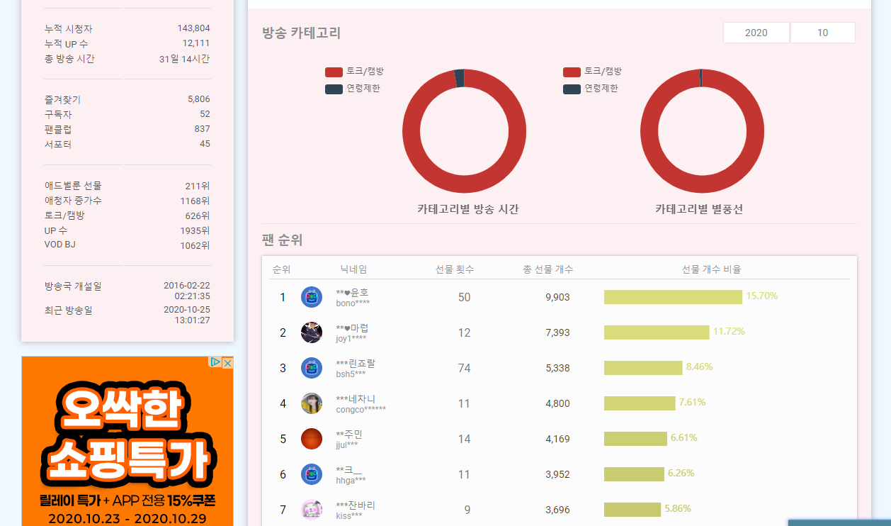 팬 순위도 위처럼 나오고요. 애드벌룬 선물, 애청자 증가수, 토크/캠방, 업 수, VOD BJ 순위도 나오네요.