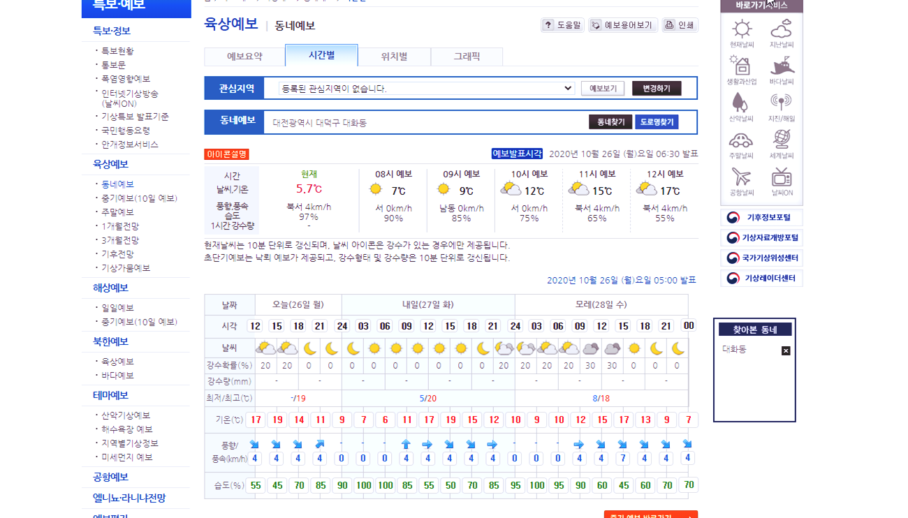 홈 > 특보·예보 > 육상예보 > 동네예보 > 시간별 |날씨|특보·예보|육상예보|동네예보|시간별 예보발표시각 2020년 10월 26일 (월)요일 06:30 발표 현재날씨는 10분 단위로 갱신되며, 날씨 아이콘은 강