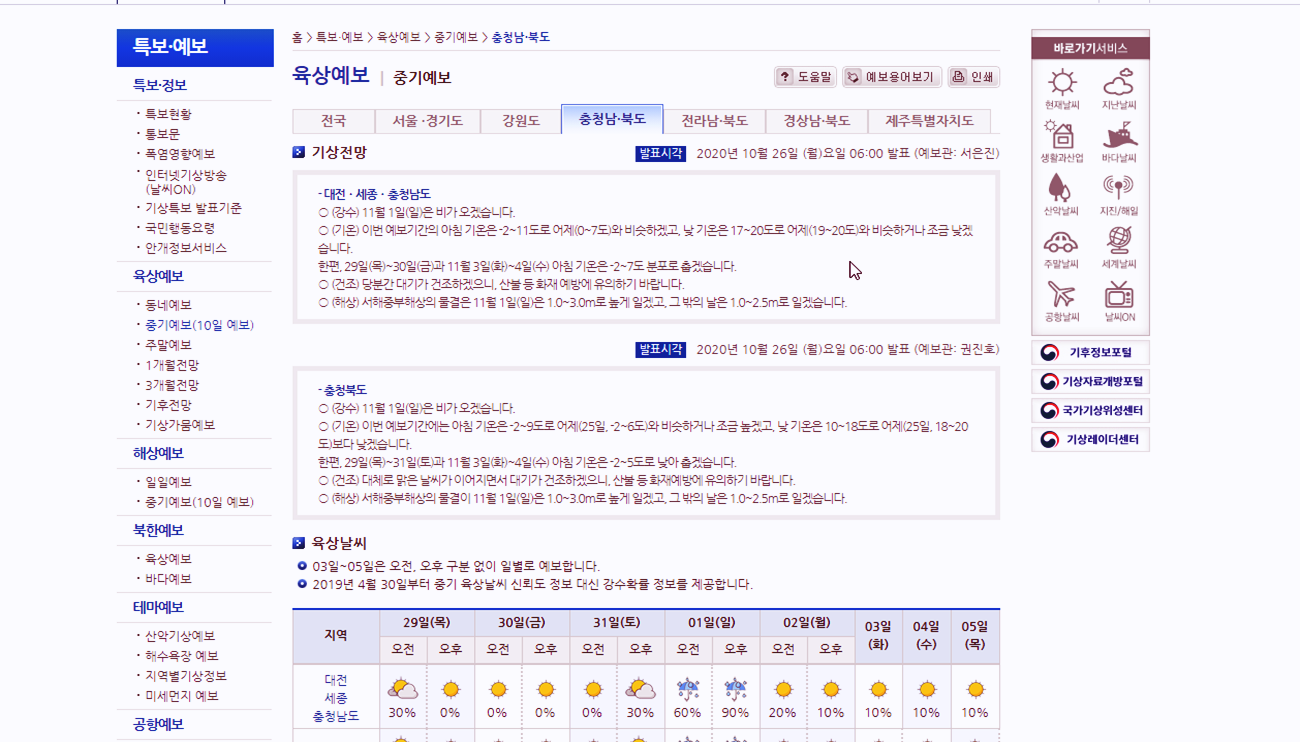 오늘 대전 날씨에 대해서 살펴보았는데요. 기상청 홈페이지의 육상예보의 중기예보도 한번 살펴보시면 좋을 것 같아요. 대전, 세종, 충청남도의 기상전망이 나와있네요. 이를 통해서 오늘 대전 날씨를 확인해보는 것도 좋습니다. 11월 1일은 비가 온다고 하네요.