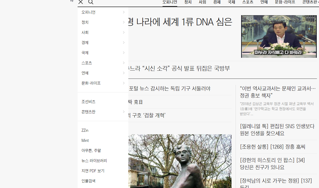 조선일보 홈페이지로 가시게 되면 오피니언, 정치, 사회, 경제, 국제, 스포츠, 연예, 문화 라이프, 조선비즈, 콘텐츠판, ZZin, Mint, 아무튼 주말, 뉴스 라이브러리, 지면 PDF 보기(종이신문 보기), 인물검색을 보실 수 있습니다.