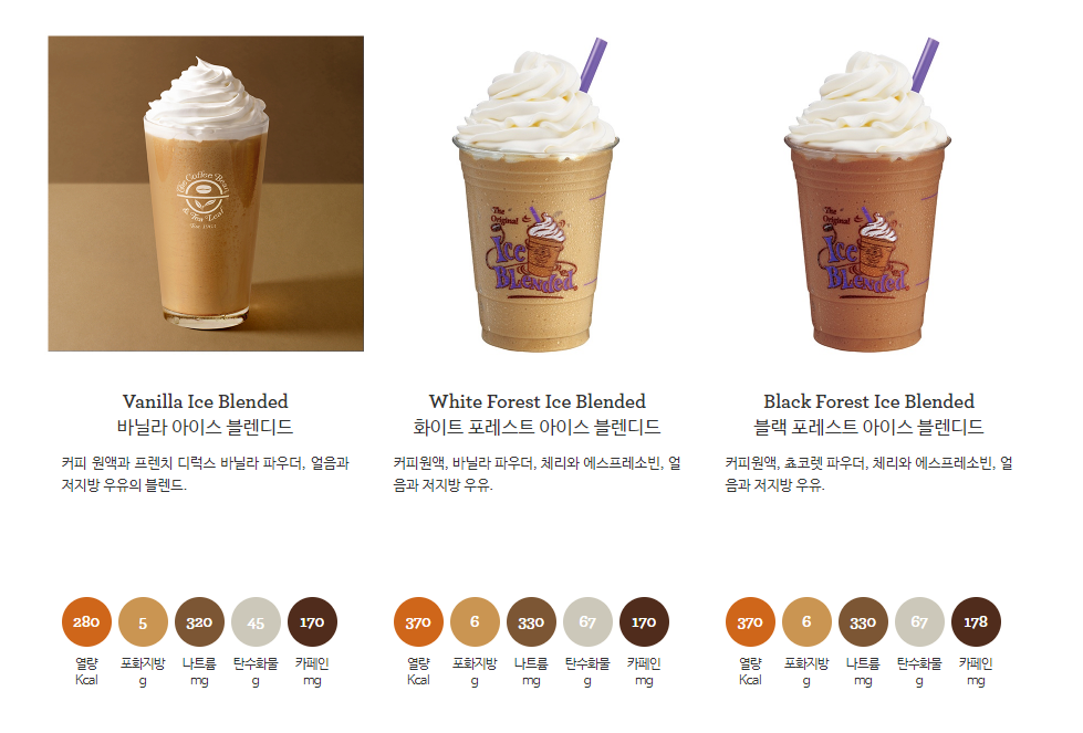 바닐라 아이스 블렌디드도 맛있어 보이네요. 열량, 포화지방, 나트륨, 탄수화물, 카페인 참고바랍니다.
