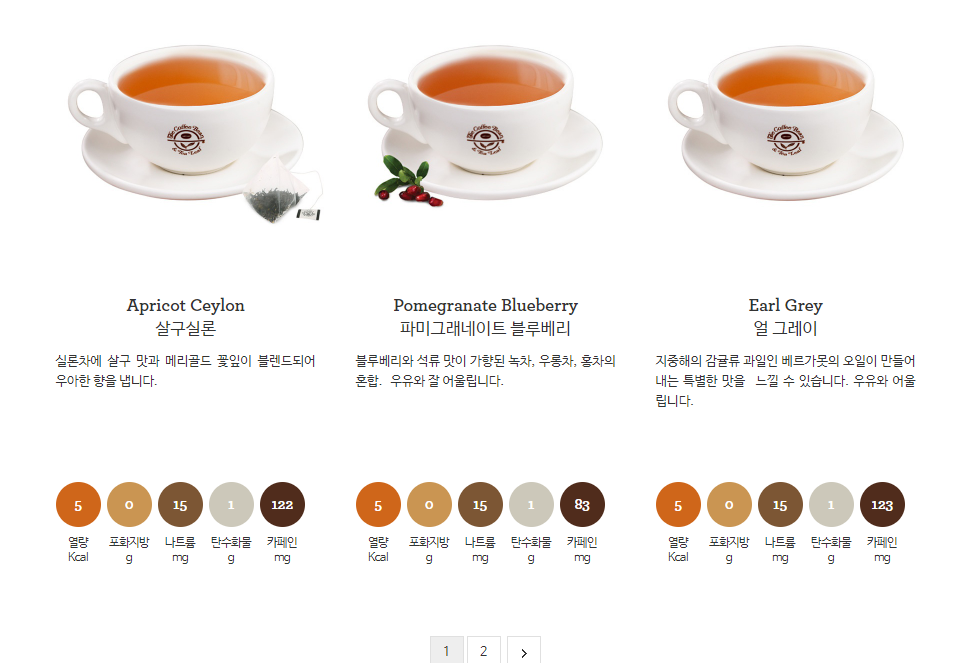 다양한 종류들의 차가 많지요. 커피빈 코리아에는 살구실론, 파마그래네이트 블루베리, 얼그레이 등의 티가 있습니다.
