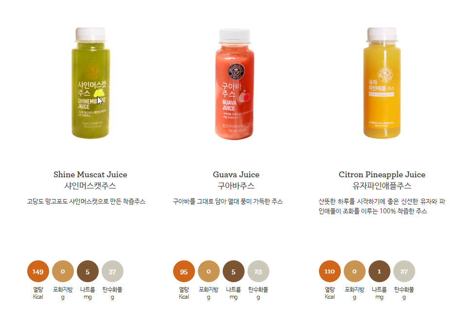 샤인머스캣주스, 구아바주스, 유자파인애플주스 등 병음료 주스도 많아요!!